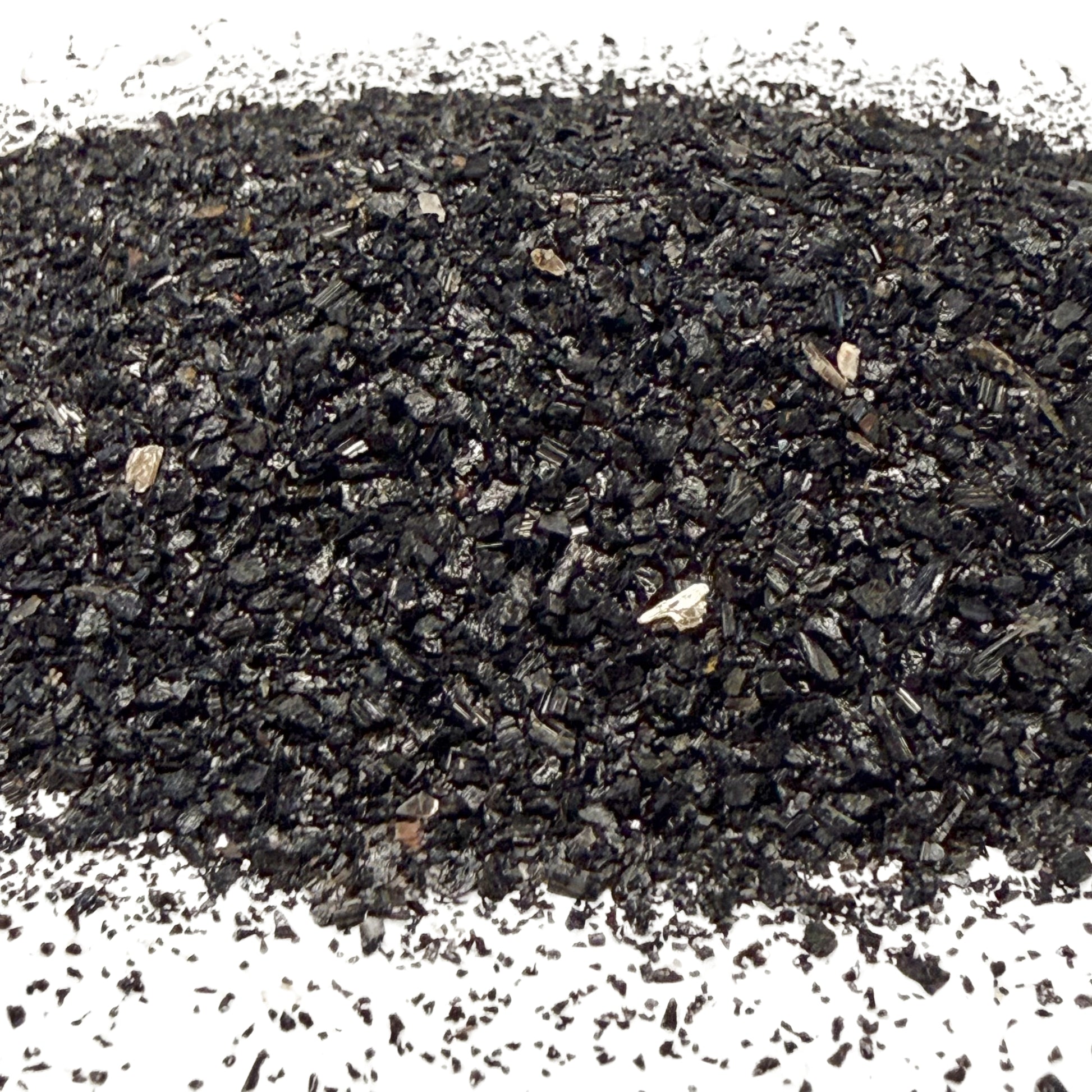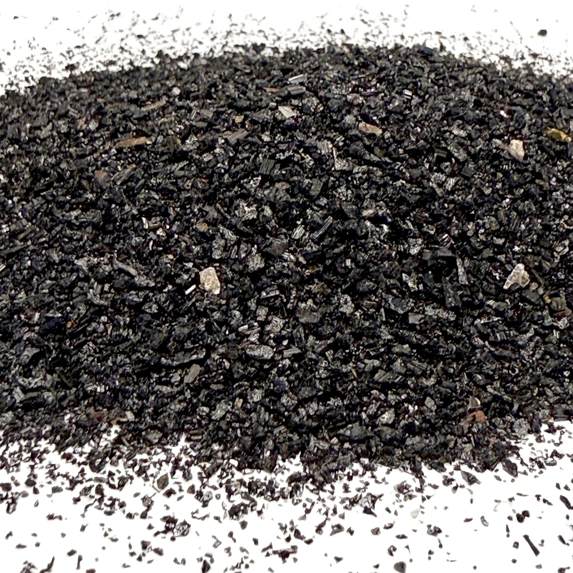 Tourmaline is not a single mineral, but a large family of closely related minerals known for their unusual optical and physical characteristics. It is chemically more complex than most minerals and displays an exceptional range of colors and varieties, though black tourmaline is the most abundant. This crushed black tourmaline, sourced from Brazil, has a striking natural sparkle. It is high quality material, with a minor amount of quartz, muscovite mica, and iron staining present, which is why it is being offered as a closeout deal.