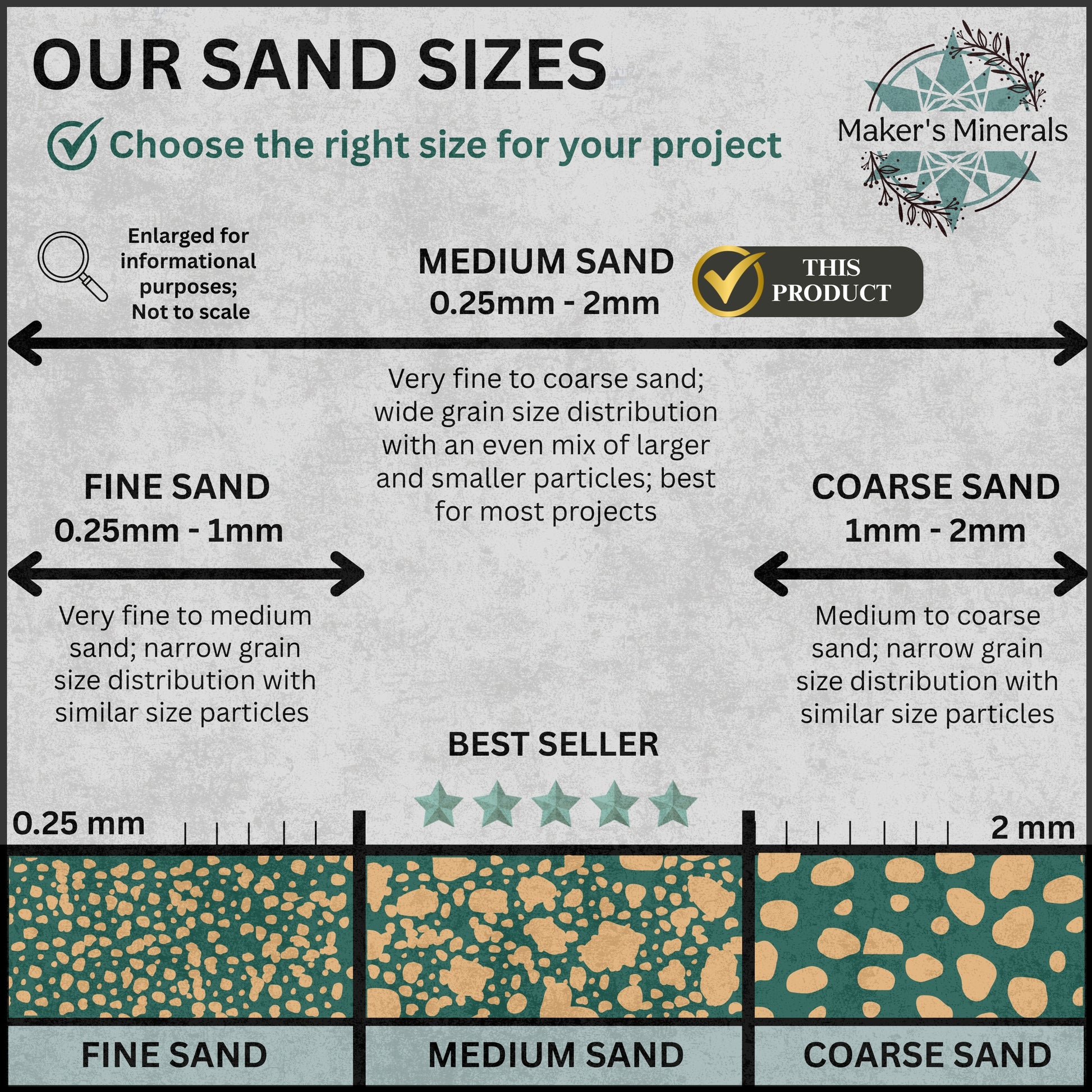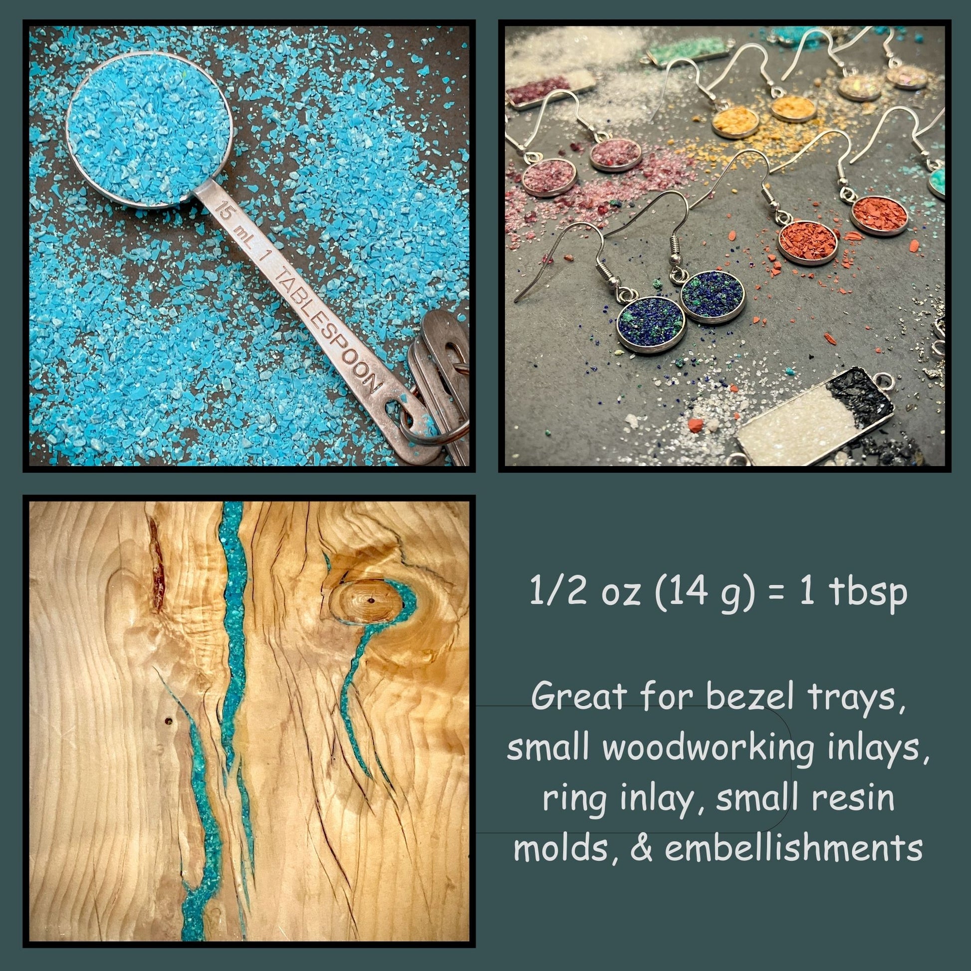 Our medium material is considered to be sand sized (fine sand to very coarse sand), ranging between 0.25 millimeters to 2 millimeters. This size is great for most woodworking inlays, memorial and resin jewelry, orgonite pyramids, ring inlay, resin molds, mosaics, terrariums, bezel cups, resin art, embellishments, and metaphysical projects.
