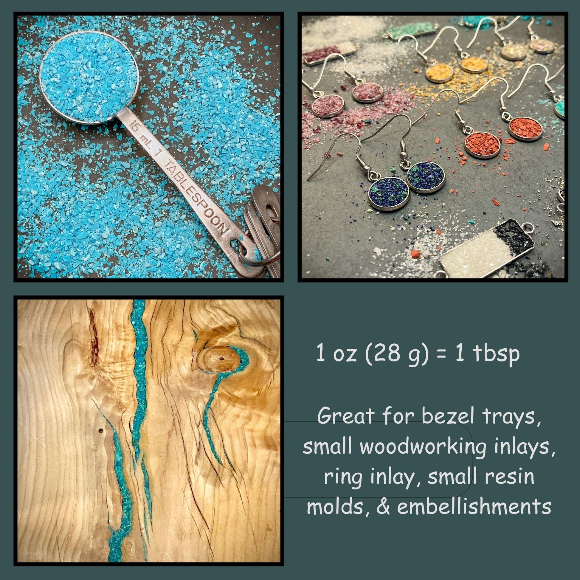 Our crushed sand-sized material ranges from very fine to coarse sand, and is available in three different size variations: 1mm to 2mm (coarse sand), 0.25mm to 2mm (medium sand), and 0.25mm to 1mm (fine sand). Our sand-sized material is ideal for a wide range of creative projects, including woodworking inlays, memorial and resin jewelry, orgonite pyramids, ring inlay, resin molds, mosaics, terrariums, bezel cups, resin art, embellishments, and metaphysical projects.