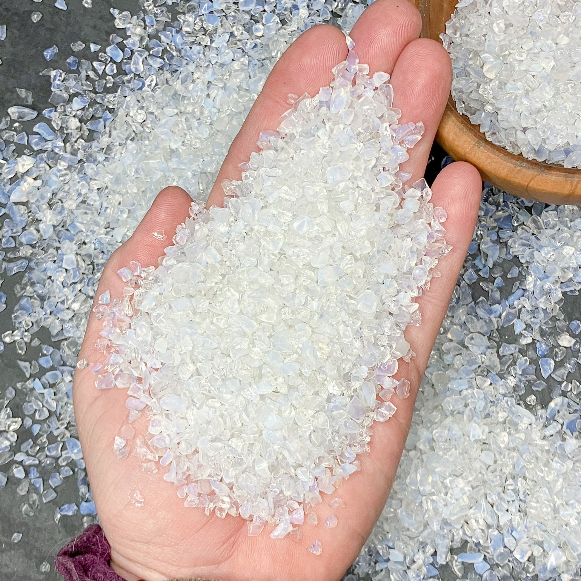 This particular crushed opalite has a translucent white color and displays subtle blue flashes of opalescence, which can be seen in our chip, coarse sand, and medium sand sizes. Unfortunately, the blue flash is not preserved when the mineral has been progressively pulverized into tiny pieces. This is the case for our fine sand and our powder sizes.