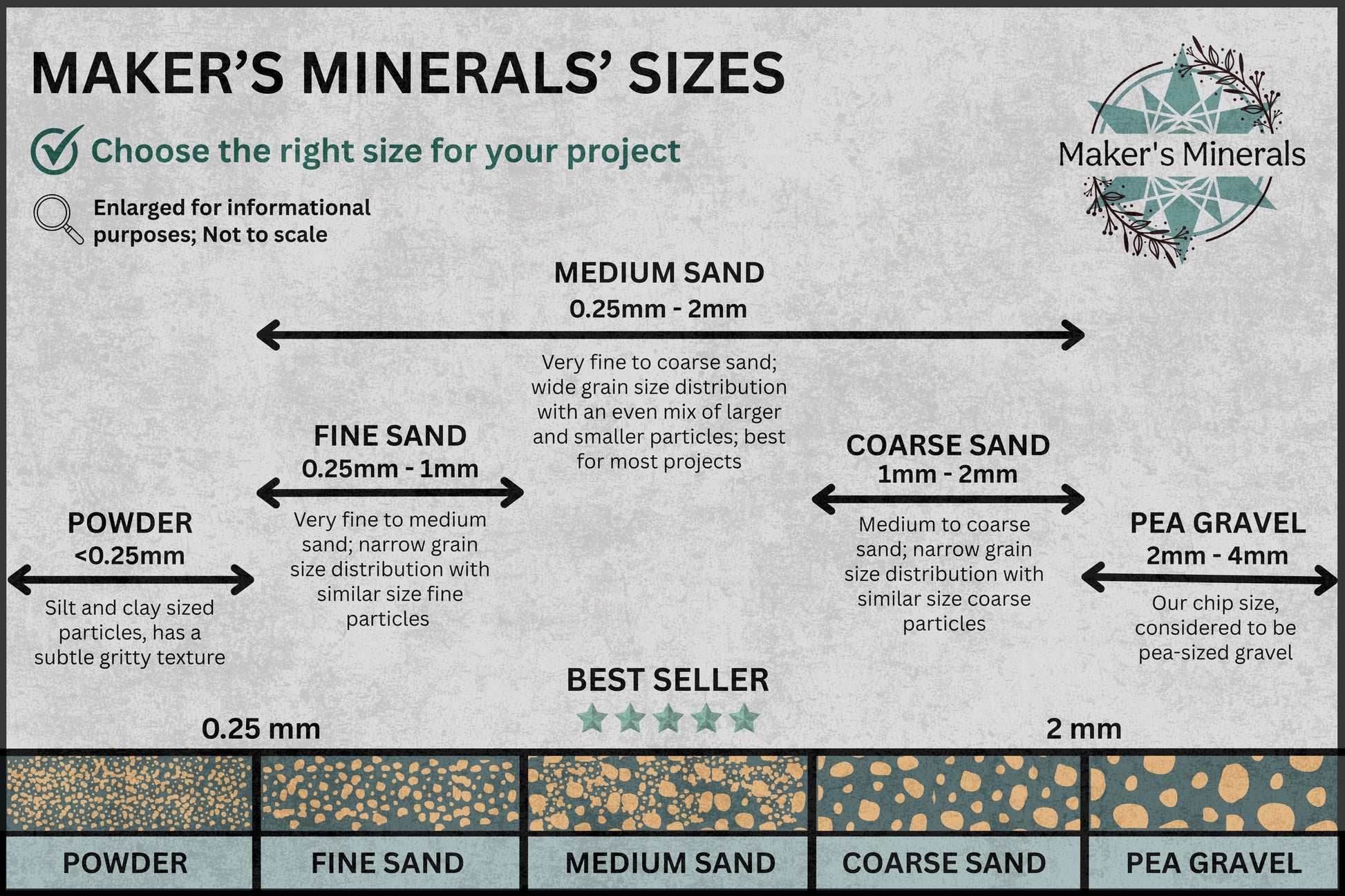 Our powdered material, consisting predominantly of silt and clay sized particles (<0.25mm), has a subtle gritty texture. Powdered minerals are great for filling in small cracks or voids, orgonite pyramids, resin molds, memorial and resin jewelry, ring inlay, resin art, and creating textured paints and pigments.