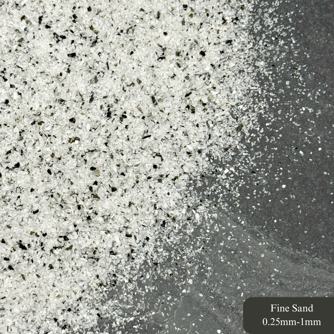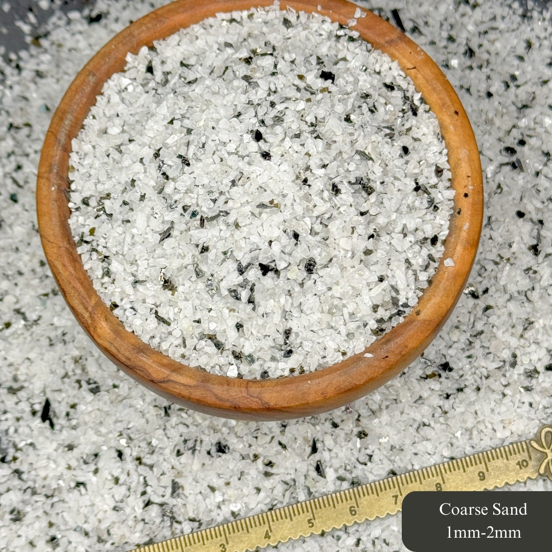 Our crushed sand-sized material ranges from very fine to coarse sand, and is available in three different size variations: 1mm to 2mm (coarse sand), 0.25mm to 2mm (medium sand), and 0.25mm to 1mm (fine sand). Our sand-sized material is ideal for a wide range of creative projects, including woodworking inlays, memorial and resin jewelry, orgonite pyramids, ring inlay, resin molds, mosaics, terrariums, bezel cups, resin art, embellishments, and metaphysical projects.